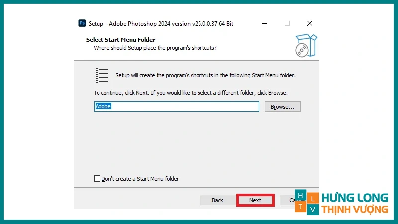 Để thuận tiện trong việc truy cập Photoshop 2024 sau khi cài đặt, bạn nên chọn ô “Create a desktop shortcut”. Tùy chọn này sẽ tạo một biểu tượng trên màn hình desktop của bạn. Sau khi chọn, nhấn nút “Next” để tiếp tục.